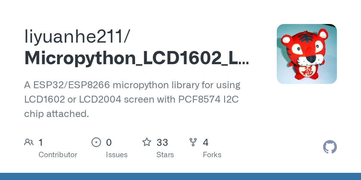 GitHub - liyuanhe211/Micropython_LCD1602_LCD2004_I2C_Lib: A ESP32/ESP8266 micropython library for using LCD1602 or LCD2004 screen with PCF8574 I2C chip attached.