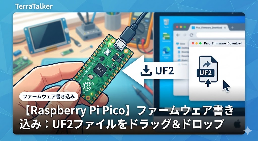 Raspberry Pi Picoをパソコンに接続し、初回ではUSBドライブとして認識される。ドライブを開き、ファームウェアをドラッグアンドドロップで移動すればファームウェアの書き込みが終了します。